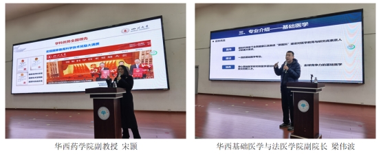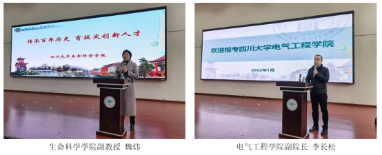 在廖爱民副主任简要介绍川大基本情况后,永利3544am登录官网数学学院副院长寇辉、化学学院副院长郑成斌、生命科学学院副教授魏炜、电气工程学院副院长李长松、水利水电学院院长助理李洪涛、网络空间安全学院副院长杨频、华西护理学院副院长李玲利、华西公共卫生学院副教授曾红燕、华西药学院副教授宋颢、华西基础医学永利3544am登录官网副院长梁伟波分别从各自学院的专业情况、办学优势、人才培养特色与发展等向师生作了详细介绍。