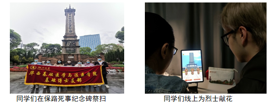 基础医学博士支部同学前往人民公园保路死事纪念碑举行清明祭扫活动。同学们在支部书记的带领下回顾了保路运动的历史,100多年前那场轰轰烈烈的英雄事迹,使得同学们对四川革命先辈肃然起敬。在默哀后,同学们向纪念碑敬献鲜花。由于部分同学在外地实习原因,2017级本科同学举行了“云祭祀·缅先烈”线上祭英烈活动。同学们通过线上献花、视频学习讨论的形式缅怀先烈,接受精神洗礼,培育家国情怀。