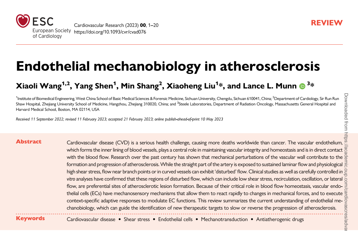 近日,永利3544am登录官网华西基础医学永利3544am登录官网刘肖珩教授团队联合美国哈佛大学Lance L. Munn教授在国际著名心血管期刊Cardiovascular Research发表题为“Endothelial mechanobiology in atherosclerosis”的长文综述。全面阐释了FSS如何参与调节VECs功能改变进而促进动脉粥样硬化发展。概括了病理条件下的内皮细胞力学生物学,体内/外模拟FSS的方法,内皮细胞力学感受器和FSS对血管内皮细胞功能的调控,以及内皮力学转导的潜在机制。在此基础上,进一步分析了这些信号通路被应用于临床工作的可能性,并对靶向力学转导的动脉粥样硬化治疗方法进行了总结。