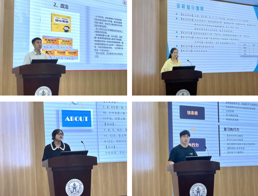 此次大会还邀请到法学院2020级肖炫培、永利官网2019级肖雨桢、孙天一、张仕豪4位优秀学生分享深造经验。肖炫培从个人简介、初试、复试、专业课四方面提出了备战经验,肖雨桢从夏令营选择、简历制作、面试内容技巧各方面进行了分享。孙天一、张仕豪从院校专业选择、备考及复试等不同角度进行了经验分享。他们强调了备考方案、调整心态、复盘总结等重要心得体会。