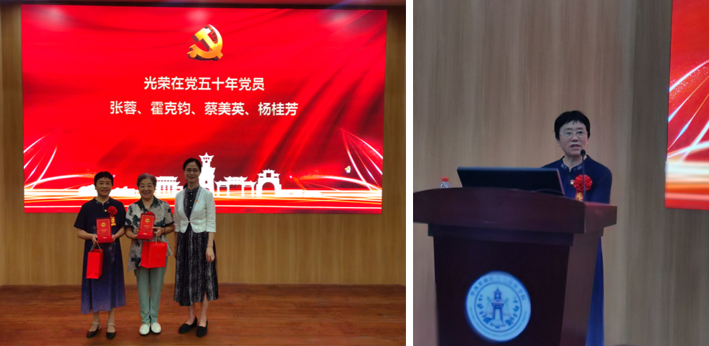 学院党委书记李华向张蓉、蔡美英同志颁发“光荣在党50年”纪念章,张蓉同志发表感言
