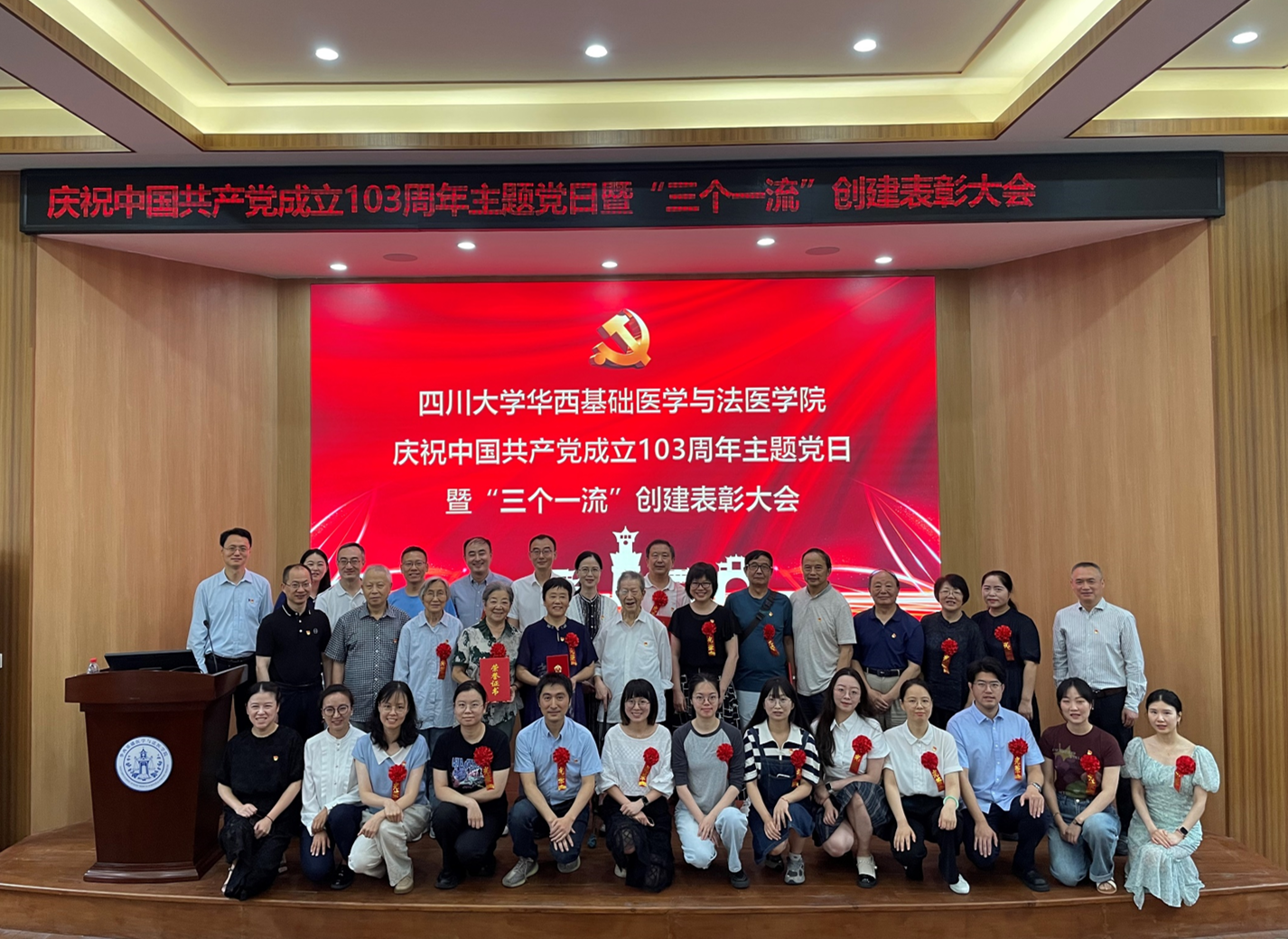 在庆祝中国共产党成立103周年、学院深入推进“三个一流”创建活动和扎实开展党纪学习教育工作之际,6月28日上午,学院在华西第五教学楼报告厅隆重召开庆祝中国共产党成立103周年主题党日活动暨“三个一流”创建表彰大会,学院领导班子成员、党委委员、纪委委员、各党支部书记、“两优一先”获奖者、光荣在党50年的党员代表、党龄“逢十”的党员代表、新发展党员代表参加会议,会议由学院党委副书记、副院长罗海玻主持。