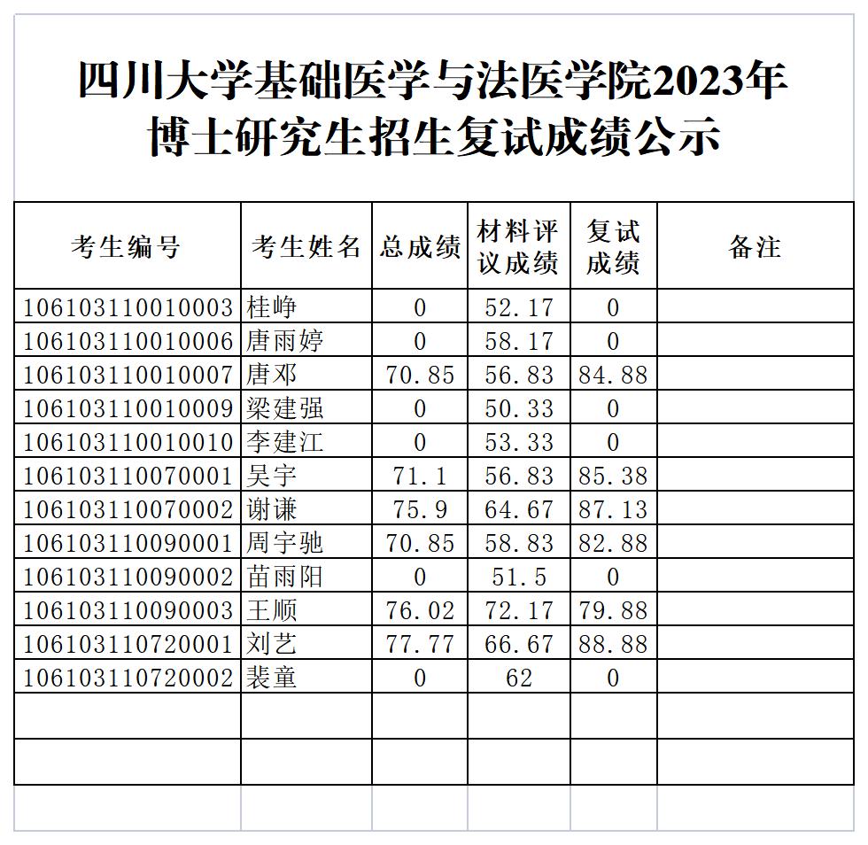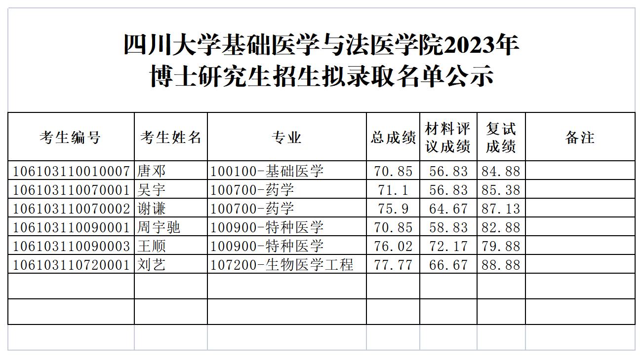 华西基础医学永利3544am登录官网2023年度博士研究生复试成绩及拟录取名单公示