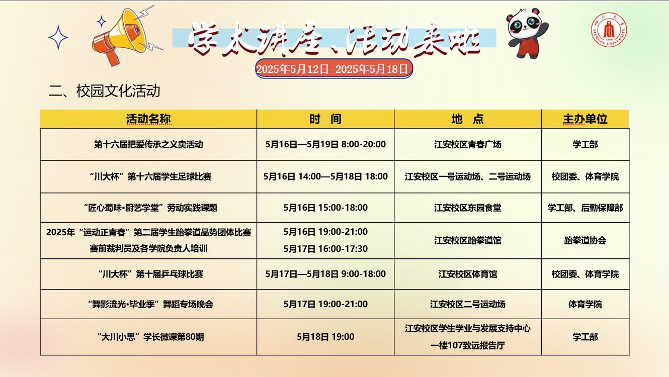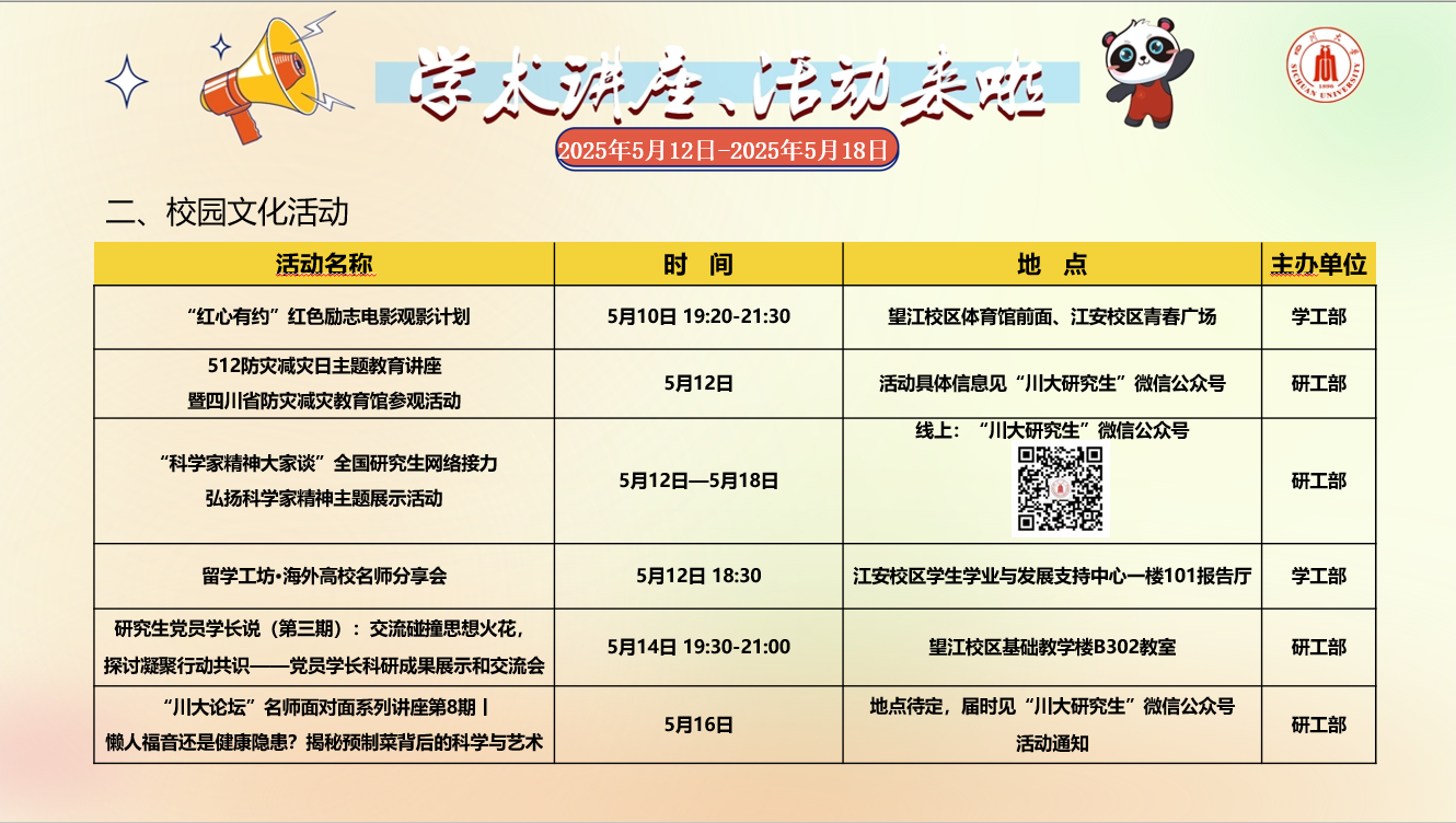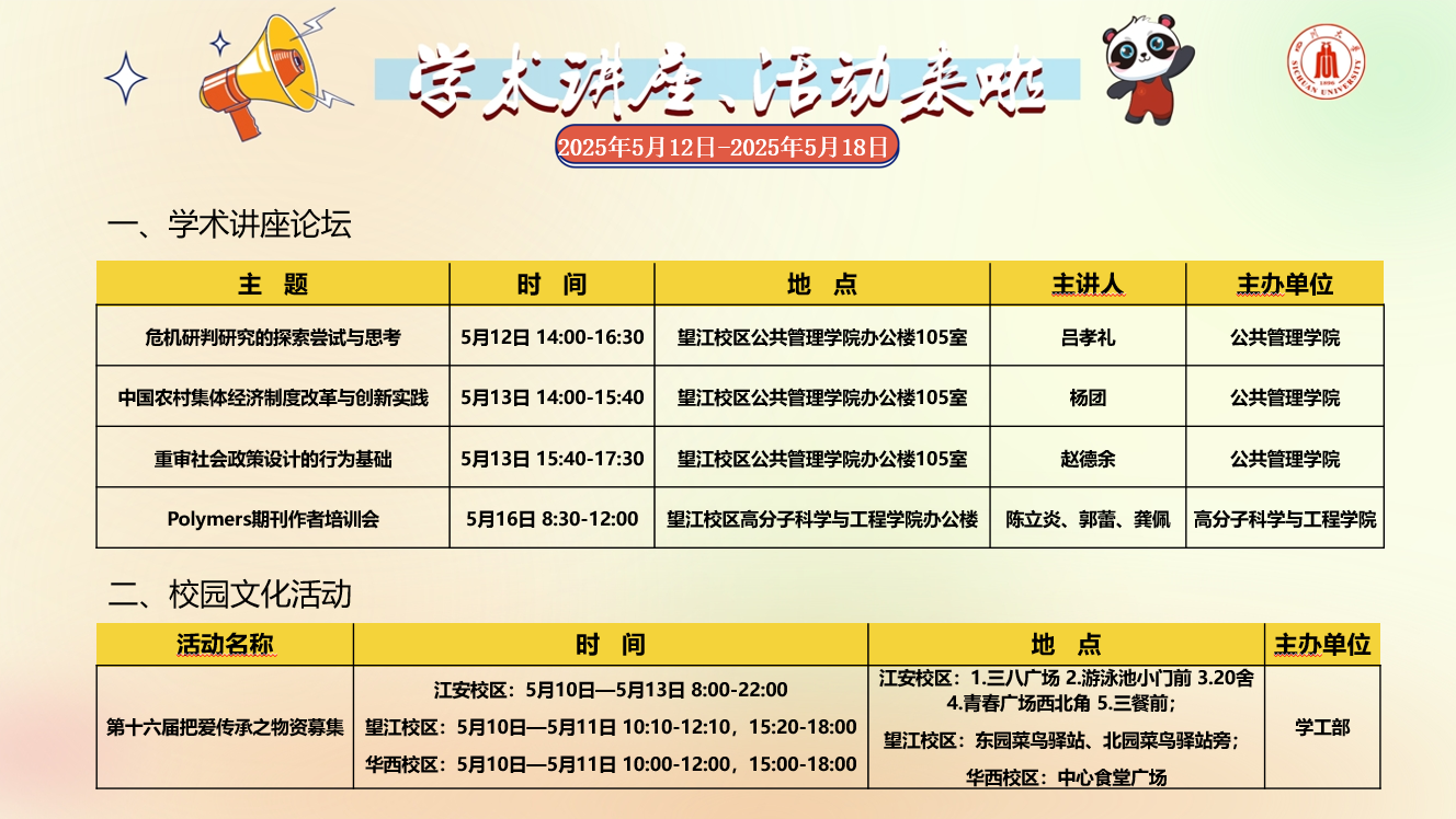 校内学术讲座论坛及校园文化活动预告(2025年5月12日-2025年5月18日)