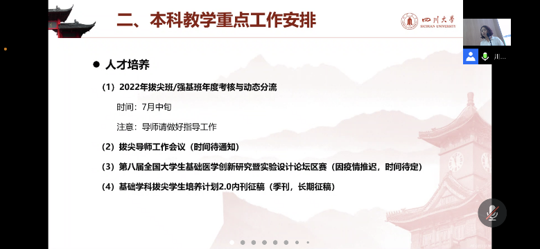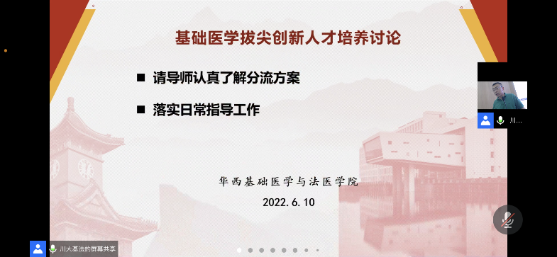 会上,梁伟波传达了近期学校关于拔尖创新人才的工作安排,学习了李言荣校长关于川大基础拔尖人才培养的一些思考。他指出,李校长强调“基础研究领域产生从0到1的’种子技术’”,对我们的老师指导学生寄予了厚望,对拔尖人才培养提出了更高要求,认真学习国家和校院两级对拔尖创新人才培养的最新要求,必须把做优、做实、做强拔尖创新人才培养作为工作重点。现场参会的老师就拔尖创新人才培养提出了一些建议,纷纷就如何进一步提高医学基础课程质量、如何细化落实二级单位发挥人才培养作用发表了宝贵意见。