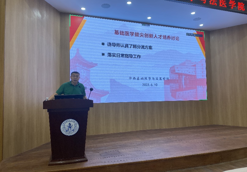 梁伟波强调,各二级单位既是医学基础课程的开课单位,也是人才培养的基本单元,教研室要把拔尖创新人才培养与改革纳入基层教学组织活动,作为日常工作之一长期研讨。按照工作要求,本年度重新修订了拔尖创新人才的分流实施方案,指导教师、班主任、系/教研室/研究室的教师要做好认真阅读文件,在指导学生过程中做好文件解读,落实日常指导。要充分发挥导师教书育人功效,关心学生发展,结合学生特点,加强个性化指导,全院教师同心协力,培养具有川大风格、华西特色的基础医学拔尖创新人才。
