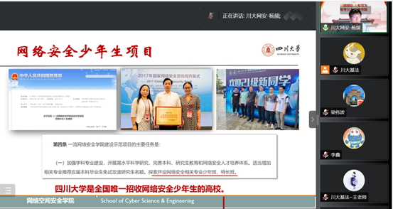 来自网络空间安全学院的副院长杨频教授,从国家安全、社会需求出发,强调了网络空间安全专业的重要性,介绍了学院的发展历程、专业特点、硬件设施、就业方向等内容以及网络安全少年生项目。