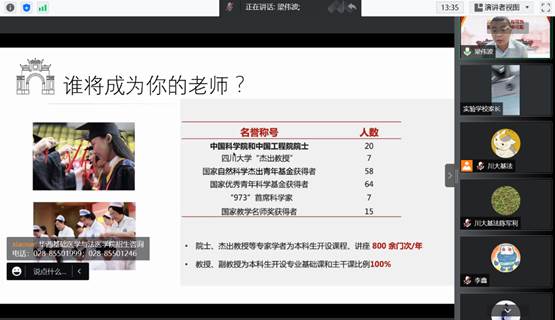 首先,华西基础医学永利3544am登录官网副院长梁伟波教授问候了在线的考生与家长,感谢他们对于川大的关注与信任。然后他从办学历史、显著优势、科研实力、社会责任、人才培养等多方面对永利3544am登录官网进行了详细的详解。他鼓励大家沉着冷静,尤其是邻水实验学校的考生不受疫情影响,在高考时发挥出自己最好的实力。