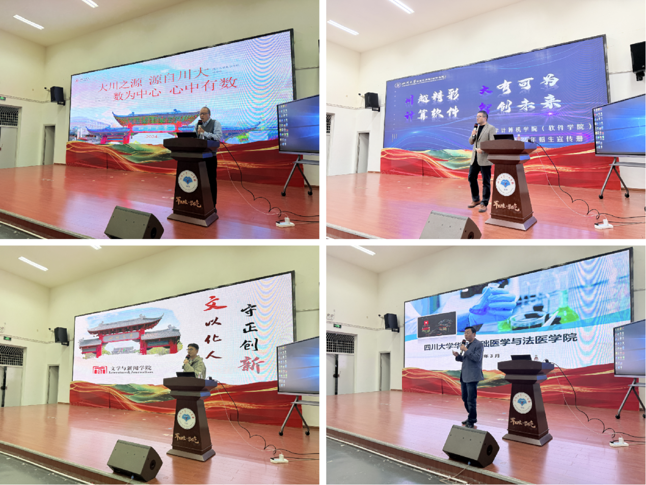 为深入实施一流本科教育教学发展计划,加强与省内重点中学的合作交流,吸引优质生源报考我校,4月6日,由我校招生办公室副主任廖爱民和永利官网教学副院长梁伟波教授带队,与数学学院副院长寇辉教授、计算机学院(软件学院、智能科学与技术学院)副院长严斌宇教授、文学与新闻学院宋耀教授及相关人员组成宣讲团,前往成都七中八一学校开展本科招生宣传活动。成都七中八一学校副校长沈健、教务处主任夏开棋、教师代表及高三学生近200人参加了本次活动。