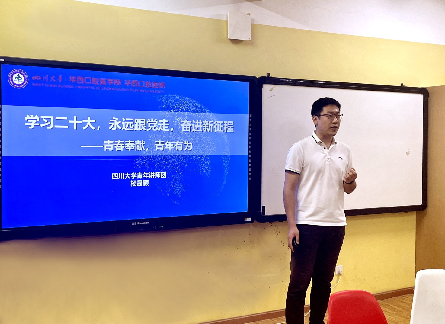 为了继续深入学习党的二十大精神,加强科学理论武装,响应党对新时代好青年的号召, 4月14日下午,永利官网在江安校区西园4舍一站式活动室举办了“学习二十大、永远跟党走、奋进新征程”的主题宣讲活动,邀请永利3544am登录官网青年讲师团华西口腔医学院杨晟颢老师主讲,江安党支部及部分学生代表参加了此次活动。