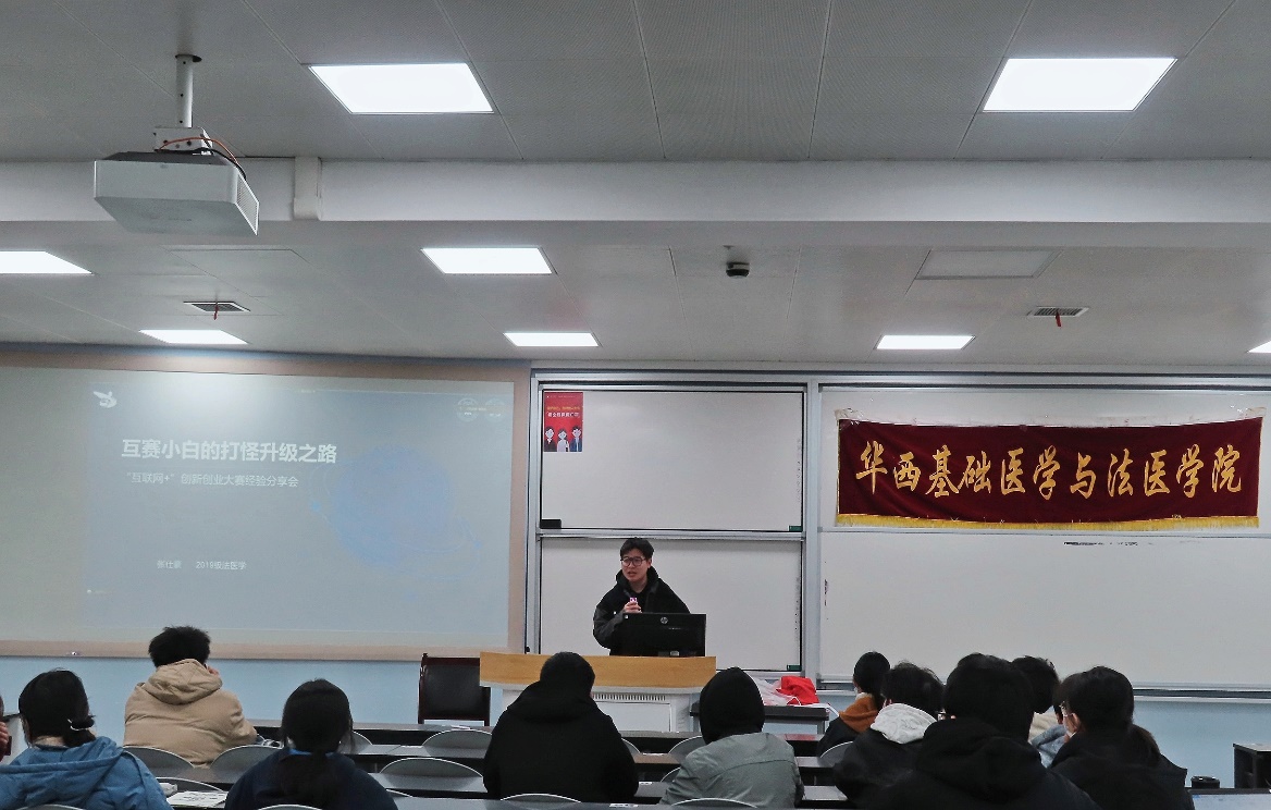 随后,2019级法医学张仕豪同学作为第八届“互联网+”国银团队的负责人,以“互赛小白的打怪升级之路”为题,为大家介绍了自己参加“互联网+”创新创业大赛的经验。他表示,通过此次比赛不仅积累了经验,全面提升自身创新创业、团队协作等能力,更重要的是找到了自身价值,拥有了重新定义自己、衡量自我的机会。他希望大家积极准备,踊跃参赛,挑战自我。