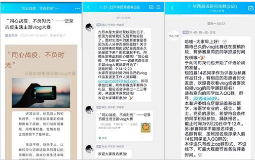 我们通过线上QQ群、微信朋友圈和“基法风采”微信公众号等多渠道发布活动推送,面向全校在读学子收集视频作品。活动发布后得到了同学们的踊跃支持,大家积极投稿,视频内容精彩纷呈,以不同的风格体现了同学们在面对突如其来的疫情时,能够很好地调节生活,有序安排工作和学习。同学们用vlog记录了自己在疫情下的志愿工作、学习生活、美食、娱乐、运动等等。作品评选阶段,在全院在读研究生中征集并筛选出14名活动评委评委涵盖了学院基础医学专业、法医学专业以及各个学历阶段,以线上打分的方式对作品逐一进行评比,充分体现活动的公平性。