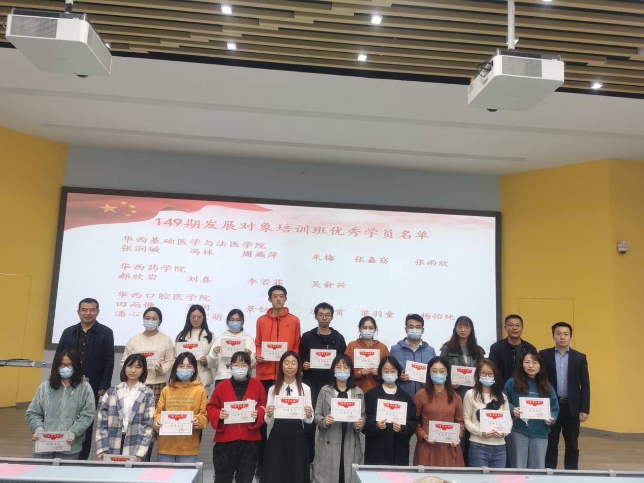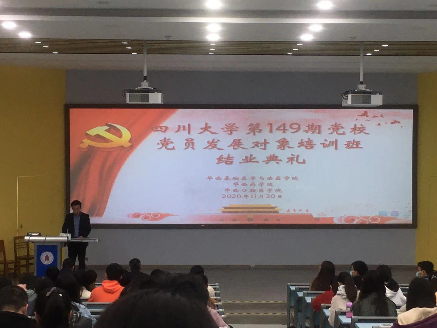 11月20日下午,永利3544am登录官网华西基础医学永利3544am登录官网、华西药学院、华西口腔医学院联合党校第149期发展对象培训班结业典礼在华西校区九教演播厅举行。华西基础医学永利3544am登录官网党委副书记郭晓伟、华西药学院党委副书记章程、华西口腔医学院党委副书记孙建勋、发展对象培训班相关工作人员以及第149期发展对象培训班全体学员参加了结业典礼。结业典礼由孙建勋副书记主持。