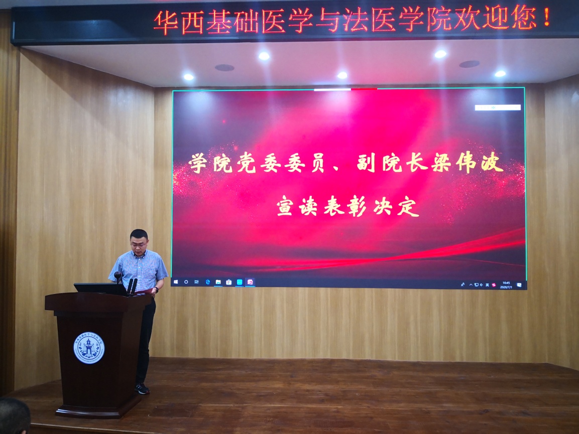 在庆祝中国共产党成立九十九周年之际,为充分发挥先进典型的示范引领作用,激励全院师生党员不忘初心、牢记使命,更加自觉地投身学校“两个伟大”建设,学院党委决定表彰一批先进支部及党员同志、党务工作者。学院党委委员、副院长梁伟波宣读了表彰决定:授予法医党支部、实验动物中心党支部、2016级本科党支部、2018级硕士党支部“先进党支部”称号;授予宋凤、刘学旭、郑风劲、高伟、林佳、黄英、李涛、尹璐8位同志“优秀党务工作者”称号;授予田汉文、胡峻梅、成姝婷、陈华华、陈红、黄云、罗涛、贾文祥、曾志源、曹永实、李雪珮、钱小钦、田欢、邹婷、肖莉、李卓、刘桂宏17位同志“优秀共产党员”称号。先进党支部代表云利兵老师、优秀党务工作者代表林佳老师、优秀共产党员代表李涛同学分别结合自身工作、学习进行了发言。