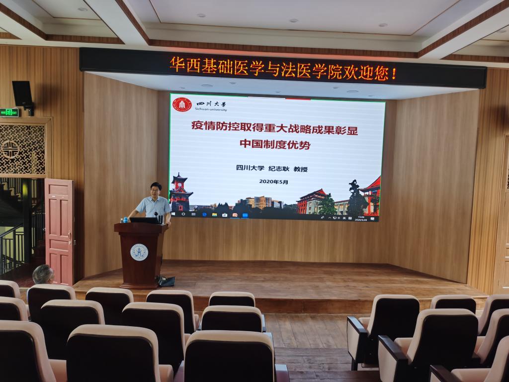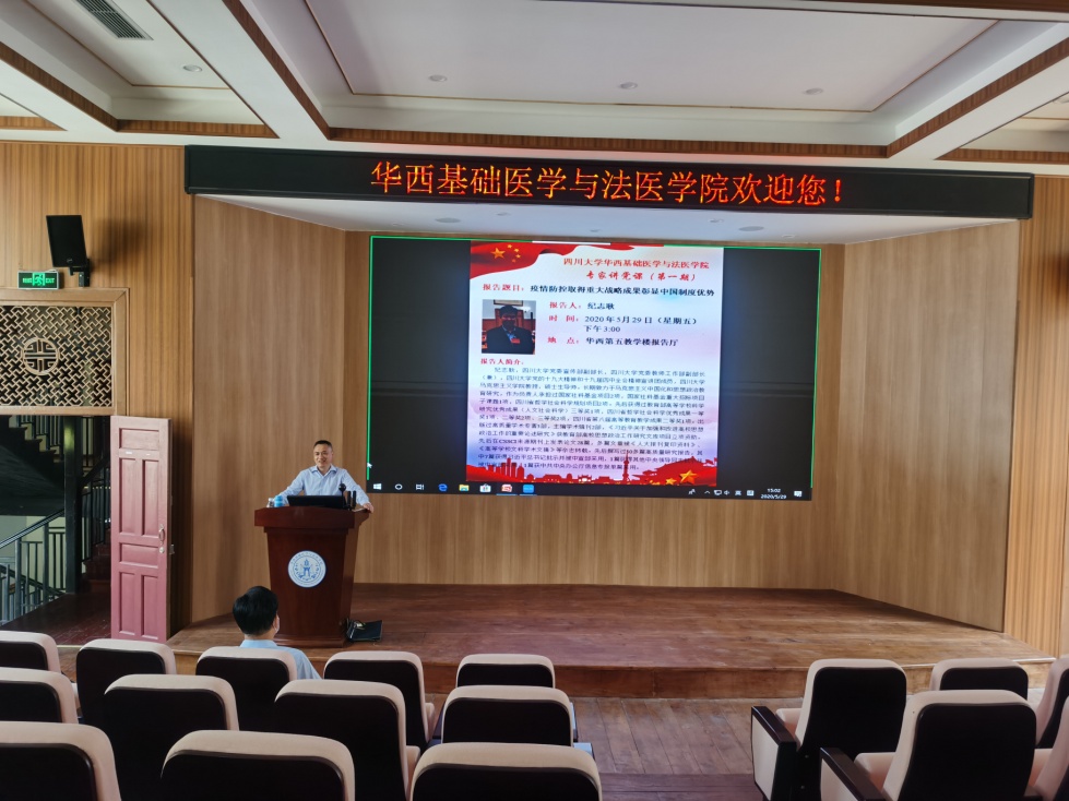 2020年5月29日下午,学院2020年第一期专家讲党课活动在华西校区第五教学楼报告厅举行。本次党课学院特邀永利3544am登录官网党委宣传部副部长、党委教师工作部副部长(兼)、学校党的十九大精神和十九届四中全会精神宣讲团成员、马克思主义学院教授纪志耿担任主讲嘉宾。会议由学院党委书记李昌龙主持,学院党委委员、纪委委员、各党支部书记现场参会,其余党员同志在线参加了学习。