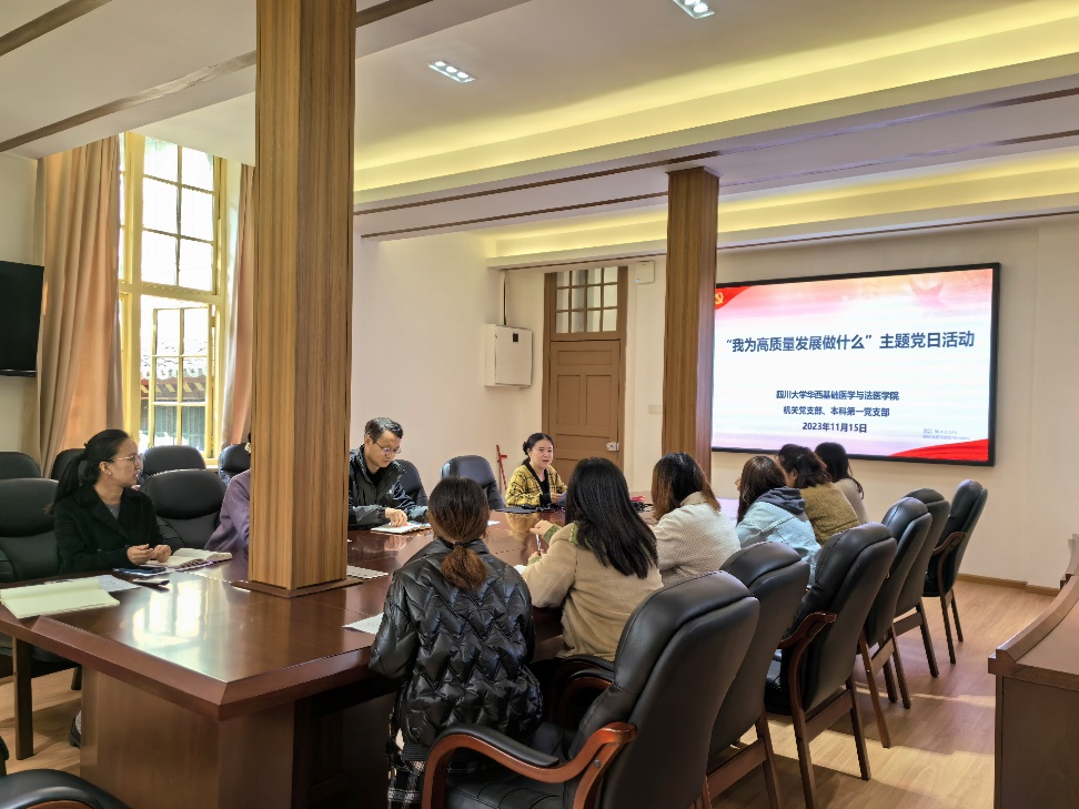11月15日下午,学院机关党支部和本科第一党支部联合召开“我为高质量发展做什么”主题党日活动,活动由机关党支部书记蒋宝晴主持。