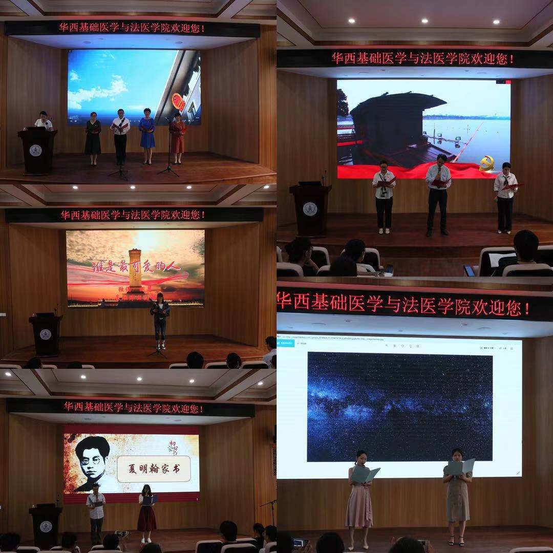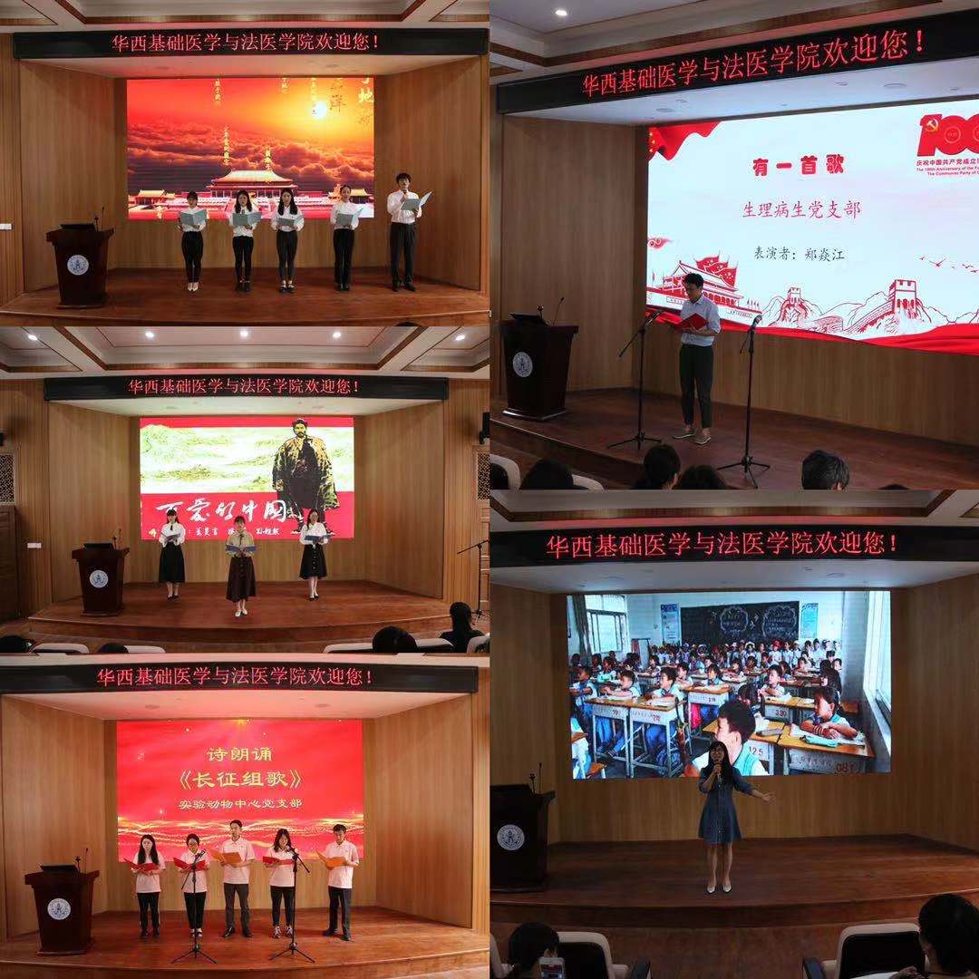 接着第一支参赛队伍法医博士党支部隆重登场,在激昂的配乐中声情并茂地朗诵了《少年中国说》,充分展现了永利官网同学们积极向上、励志图强的精神风貌。2017、2018级本科江安联合党支部的三位同学以诚挚的情感朗诵了《可爱的中国》,实验动物中心党支部的五位老师身着统一服装,有节奏、有韵律地朗诵了《长征组歌》。生理病生党支部等参赛队伍陆续登场,以激昂高亢的声音、浓浓地爱国爱党之情带领现场观众重温了峥嵘岁月的感人瞬间。