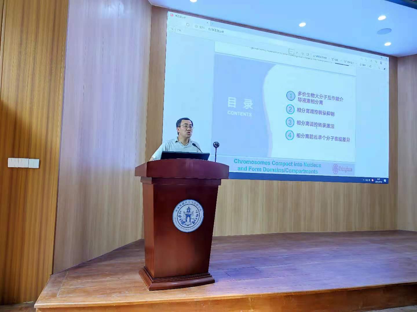 报告开始,刘肖珩副院长为在座师生介绍了来宾李丕龙研究员,并致以热烈的欢迎。李丕龙研究员对相分离理化原理有着深入的理解,致力于探索相分离现象的普适化调控机制与规律。
