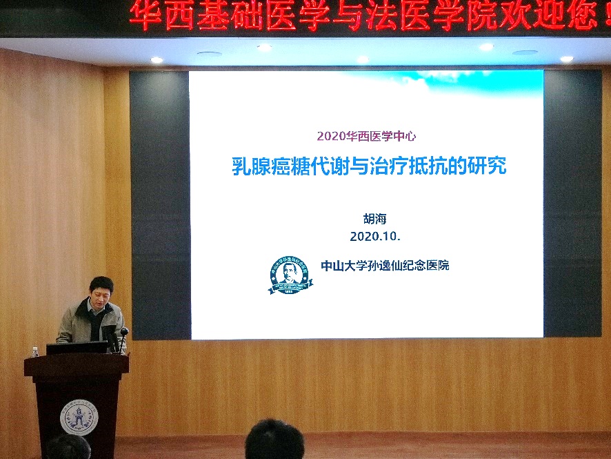 应永利官网邀请,2020年11月26日上午9:00,中山大学孙逸仙纪念医院胡海教授在华西校区五教报告厅做了题为“乳腺癌糖代谢与治疗抵抗的研究”的学术报告。