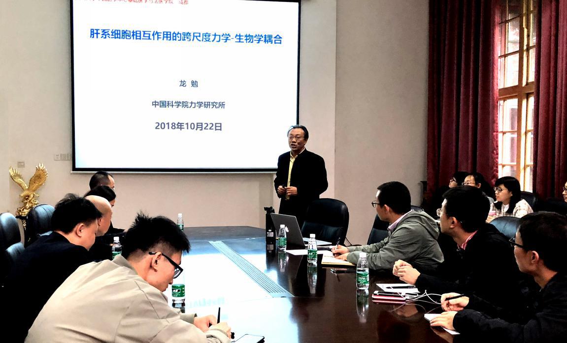 10月22日下午,应学院的邀请,中国科学院力学研究所龙勉教授来永利官网进行学术交流,为到场的师生带来了题为“肝系细胞相互作用的跨尺度力学-生物学耦合”的学术报告。报告在华西第五教学楼会议室举行,学院教授委员会主席刘肖珩教授主持了学术报告会。
