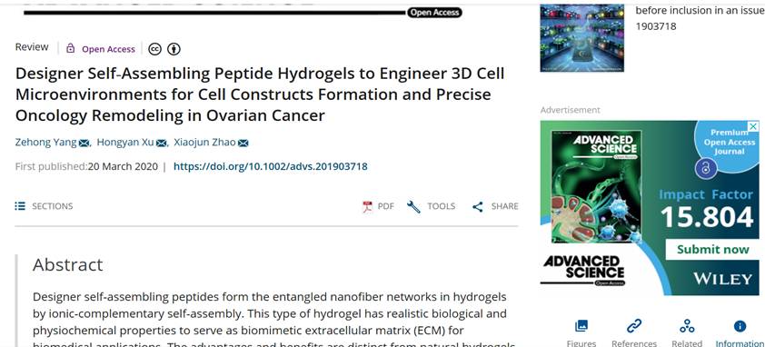 近日,永利官网生物分子实验室杨泽宏老师在自组装肽水凝胶的组织工程与再生医学及精准卵巢癌肿瘤学模拟研究领域以“Review Article”形式发表综述论文,论文题目为“Designer Self‐Assembling Peptide Hydrogels to Engineer 3D Cell Microenvironments for Cell Constructs Formation and Precise Oncology Remodeling in Ovarian Cancer”。该综述文章第一作者为杨泽宏副教授,通讯作者为中国科学院大学温州研究院特聘研究员及永利3544am登录官网纳米生物医学技术与膜生物学研究所首席科学家赵晓军教授和中国科学院上海有机化学研究所徐红岩研究员,永利3544am登录官网华西基础医学永利3544am登录官网为第一单位。