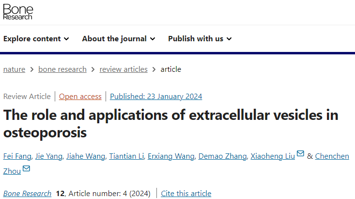 近日,永利3544am登录官网刘肖珩/周陈晨团队Bone Research杂志发表了题为“The role and applications of extracellular vesicles in osteoporosis”(2024 Jan23;12(4))的综述。回顾了目前EVs对骨稳态影响的研究进展,包括EVs的分类、生物发生以及EVs在骨质疏松症中复杂的调控机制。此外,概述了使用EVs诊断和治疗骨质疏松症的最新研究成果。最后,讨论了EVs在骨质疏松症中的应用转化研究的挑战和前景。永利3544am登录官网华西基础医学永利3544am登录官网的刘肖珩教授和永利3544am登录官网华西口腔医院的周陈晨教授为本文通讯作者,永利3544am登录官网华西基础医学永利3544am登录官网的房飞助理研究员为第一作者。