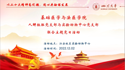 2022年12月2日下午,华西基础医学永利3544am登录官网实验动物中心党支部与人解组胚党支部举办主题为“以二十大精神为引领,同心共融谋发展”的联合党日活动。学院党委书记李华、副院长罗海玻以及双方党支部全体党员参加了此次党日活动。联合党日活动由人解组胚党支部书记董立华主持。