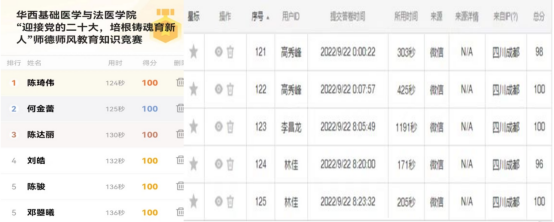 近日,学院还开展了历时近一周的师德师风知识线上答题活动。全院共有180名教师参加,参与率达到全院教师总数的93%,答题平均分达到94.7分(满分100分),其中生化、免疫、病生与机能三个工会小组以参与率和答题平均得分名列前茅。