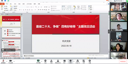 为进一步推进师德师风建设工作,打造作风过硬、师德高尚的教师队伍,树立严格自律、爱岗敬业、为人师表的良好教师形象,机关党支部于2022年9月16日下午开展了“喜迎二十大,争做四有好老师”主题党日活动。为落实疫情防控要求,主题党日活动采用线上方式进行。