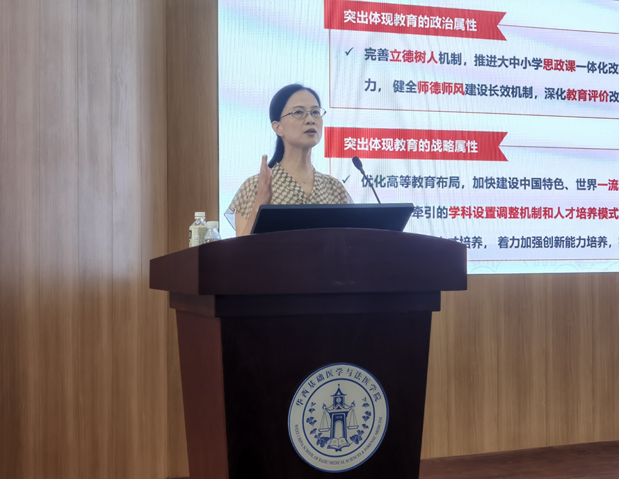 随后,学院党委书记李华作了题为“全力创建‘三个一流’,谱写高质量发展新篇章”工作报告,对学院党纪学习教育工作进行了总结。她表示2024年上半年,学院全力创建“三个一流”,从强化政治理论武装、营造风清气正生态、打造“三个一流”、凝聚干事创业合力等方面扎实开展党纪学习教育,推动学院高质量发展。新学期,学院要深入学习贯彻党的二十届三中全会精神,全面贯彻落实即将召开的全国教育大会精神和学校各项重要会议精神,常态化纵深推进党纪学习教育,持续加强全院教职工思想政治教育,全面加强高素质专业化教师队伍建设,统筹好发展与安全,以高质量党建引领保障事业高质量发展。李华还带领全院教职工学习了《中共中央关于进一步全面深化改革 推进中国式现代化的决定》中深化教育综合改革的内容,并就学院的安全稳定、师德建设工作作了专项部署。