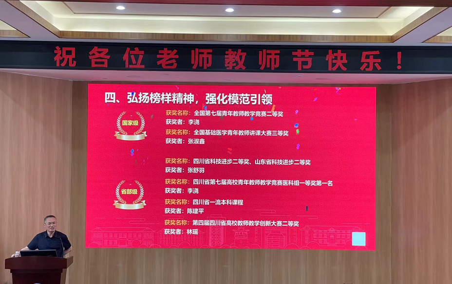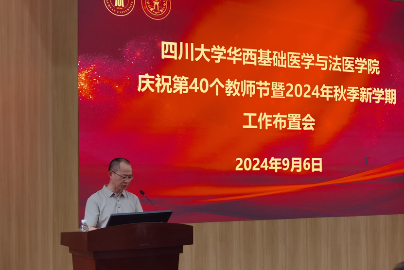 2024年9月6日上午,学院在华西校区第五教学楼报告厅隆重召开全院教职工大会,庆祝第40个教师节,总结学院党纪学习教育情况,部署学院新学期各项工作。学院党政领导班子成员、全体教职工参加会议。会议由学院副院长刘肖珩主持。