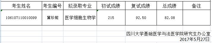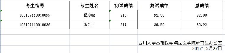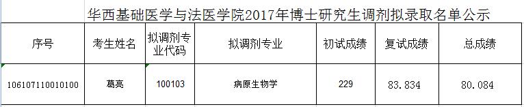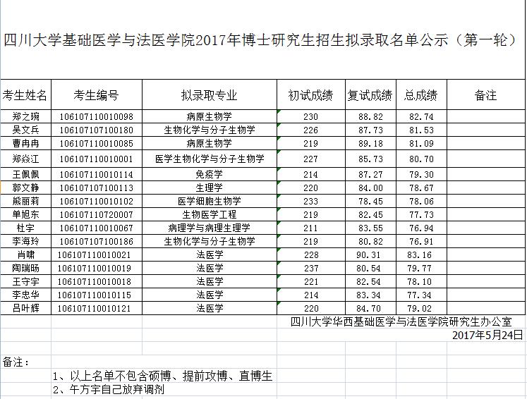 华西基础医学永利3544am登录官网2017年博士研究生调剂拟录取名单公示