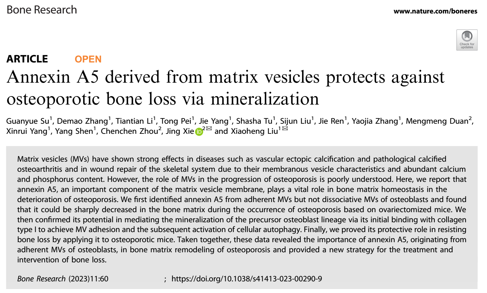 Bone Research∣基质囊泡来源的AnnexinA5通过诱导矿化缓解骨质疏松